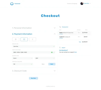 Done with the second task of the @Daily_UI challenge: A checkout page for a tech store named ‘Techie’. Hope you like it!