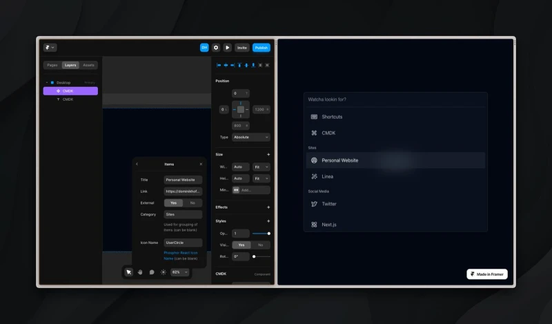 The cmdk menu for @Framer now shows the page you're currently on in the top left. Helps quite a bit for navigating your website.